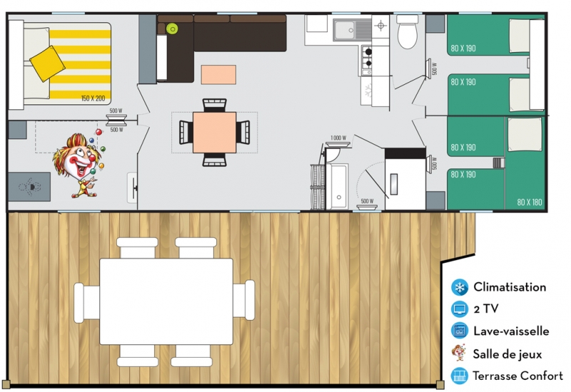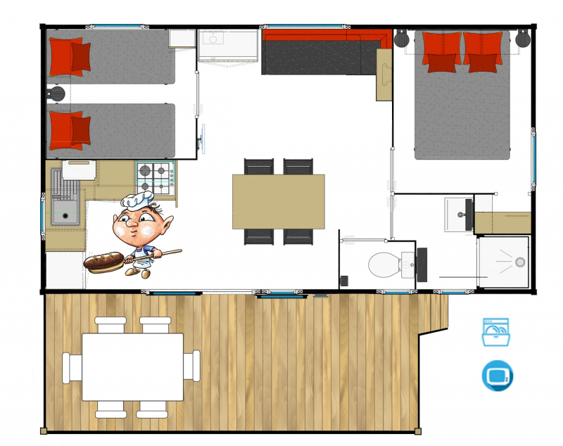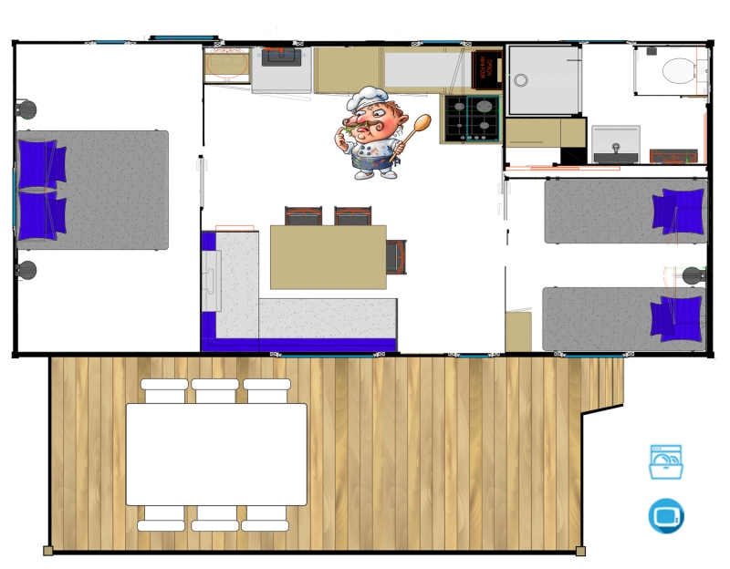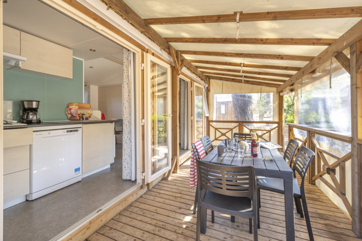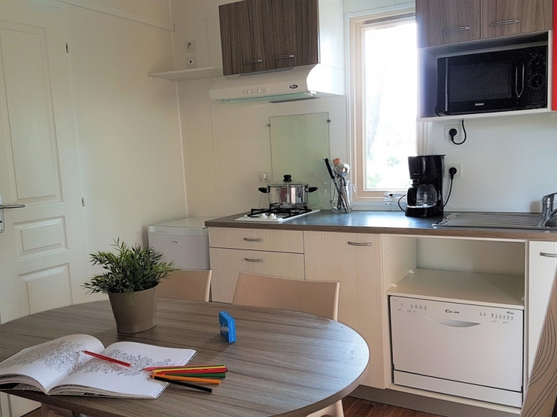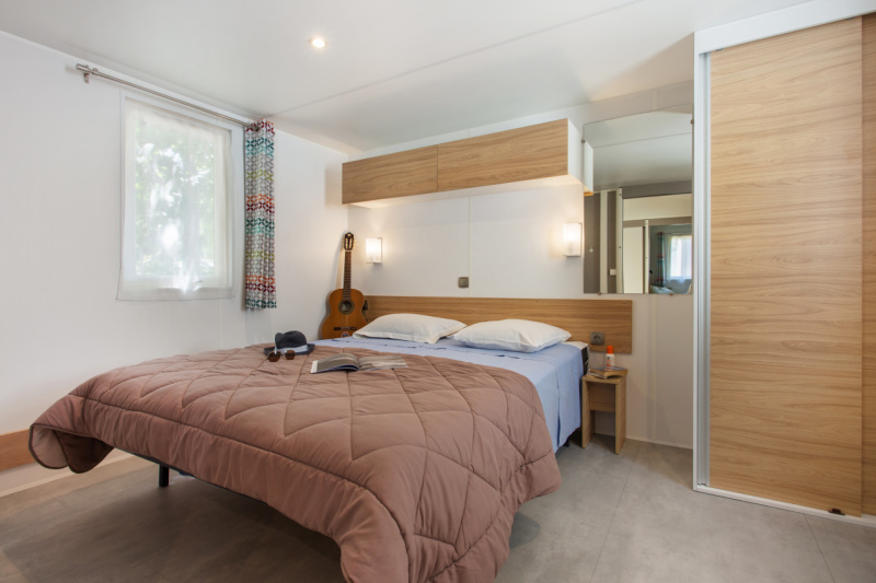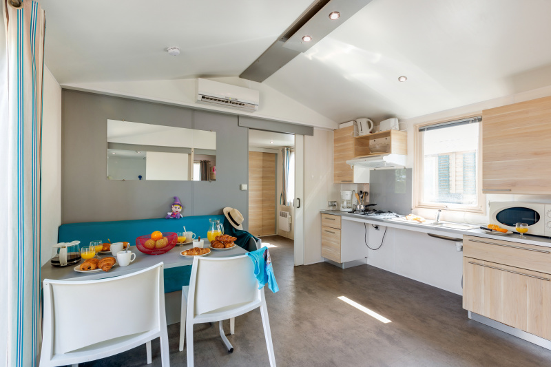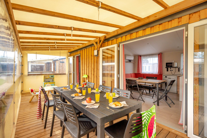 Nous lui avons donc construit un hébergement à son image. Un grand mobil home, de l’espace, de la clarté et le top des prestations pour un farniente de grande qualité.