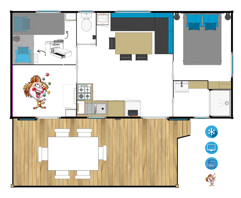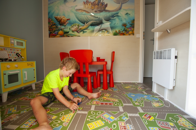 Le mobil-home de bizouquet comprend : • Une salle de jeux hyper colorée avec jeux (évidemment) et télé ! • Une salle de bain spacieuse pour que Papa puisse utiliser la baignoire bébé sans se gratter la tête • Une table à langer • Une terrasse sécurisée pour que Bizouquet ne se fasse pas la belle quand Maman a le dos tourné 😉 • Des prises sécurisées • Un kit bébé avec baignoire, chaise haute et lit parapluie – sur demande uniquement Nous avons tout tenté… Mais malheureusement pour Bizouquet, notre logement a toujours des coins 😉