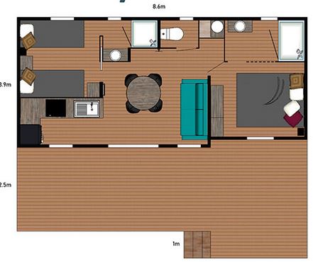 Il possède une terrasse intégrée avec salon de jardin et 4 chaises, et un espace bar avec 2 tabourets hauts.