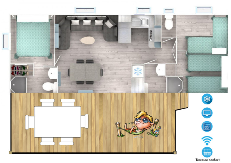 Nous lui avons donc construit un hébergement à son image. Un grand mobil home, de l’espace, de la clarté et le top des prestations pour un farniente de grande qualité.