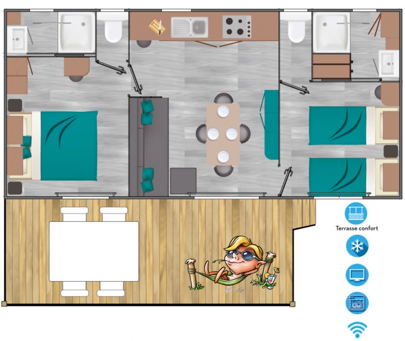 Vous pourrez accéder librement au camping et aux nombreuses prestations offertes par celui-ci: piscines, toboggans, aire de jeux, et animations.