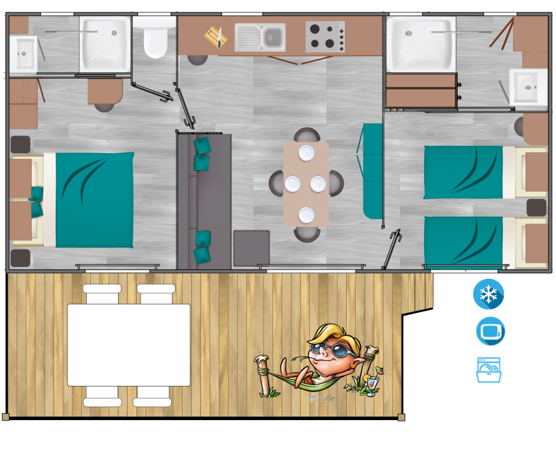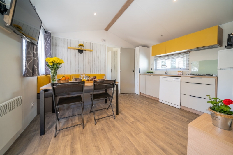 Nous lui avons donc construit un hébergement à son image. Un grand mobil home, de l’espace, de la clarté et le top des prestations pour un farniente de grande qualité.