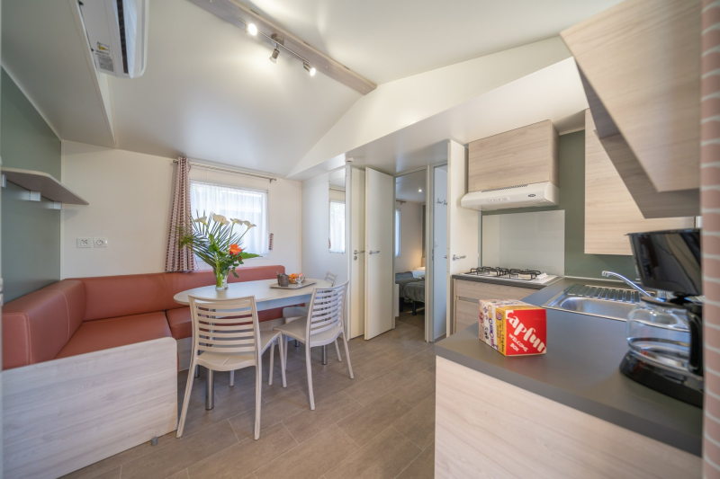 Le Tribu + Top Presta est conçu spécialement pour les grandes familles jusqu’à 10 personnes, qui ont besoin de beaucoup d'espace ! C'est un grand emplacement de 170 m² sur lequel 2 mobil-homes partagent une grande terrasse ! Le premier mobil home se compose ainsi :