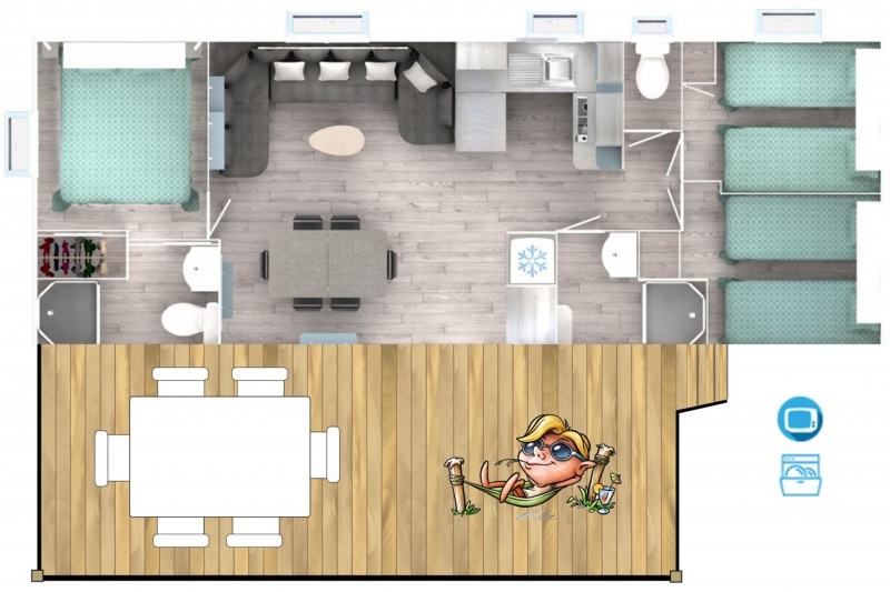 Nous lui avons donc construit un hébergement à son image. Un grand mobil home, de l’espace, de la clarté et le top des prestations pour un farniente de grande qualité.