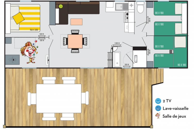 Le mobil-home de bizouquet comprend : • Une salle de jeux hyper colorée avec jeux (évidemment) et télé ! • Une salle de bain spacieuse pour que Papa puisse utiliser la baignoire bébé sans se gratter la tête • Une table à langer • Une terrasse sécurisée pour que Bizouquet ne se fasse pas la belle quand Maman a le dos tourné 😉 • Des prises sécurisées • Un kit bébé avec baignoire, chaise haute et lit parapluie – sur demande uniquement Nous avons tout tenté… Mais malheureusement pour Bizouquet, notre logement a toujours des coins 😉