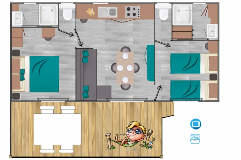 Nous lui avons donc construit un hébergement à son image. Un grand mobil home, de l’espace, de la clarté et le top des prestations pour un farniente de grande qualité.