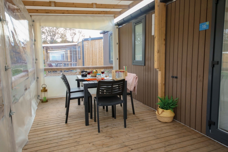 Terrasse confort : pour les soirées parfois froides ou les jours de pluie. Profiter de vos vacances tout au long de la saison. Bâches que vous pouvez ouvrir et fermer à votre guise.